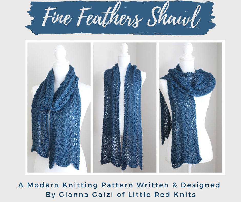 Congratulations on finishing your Fine Feathers Shawl! Tag me on your socials @littleredknits and use the hashtags #FineFeathersShawl and #LittleRedKnits when sharing your finished pieces.