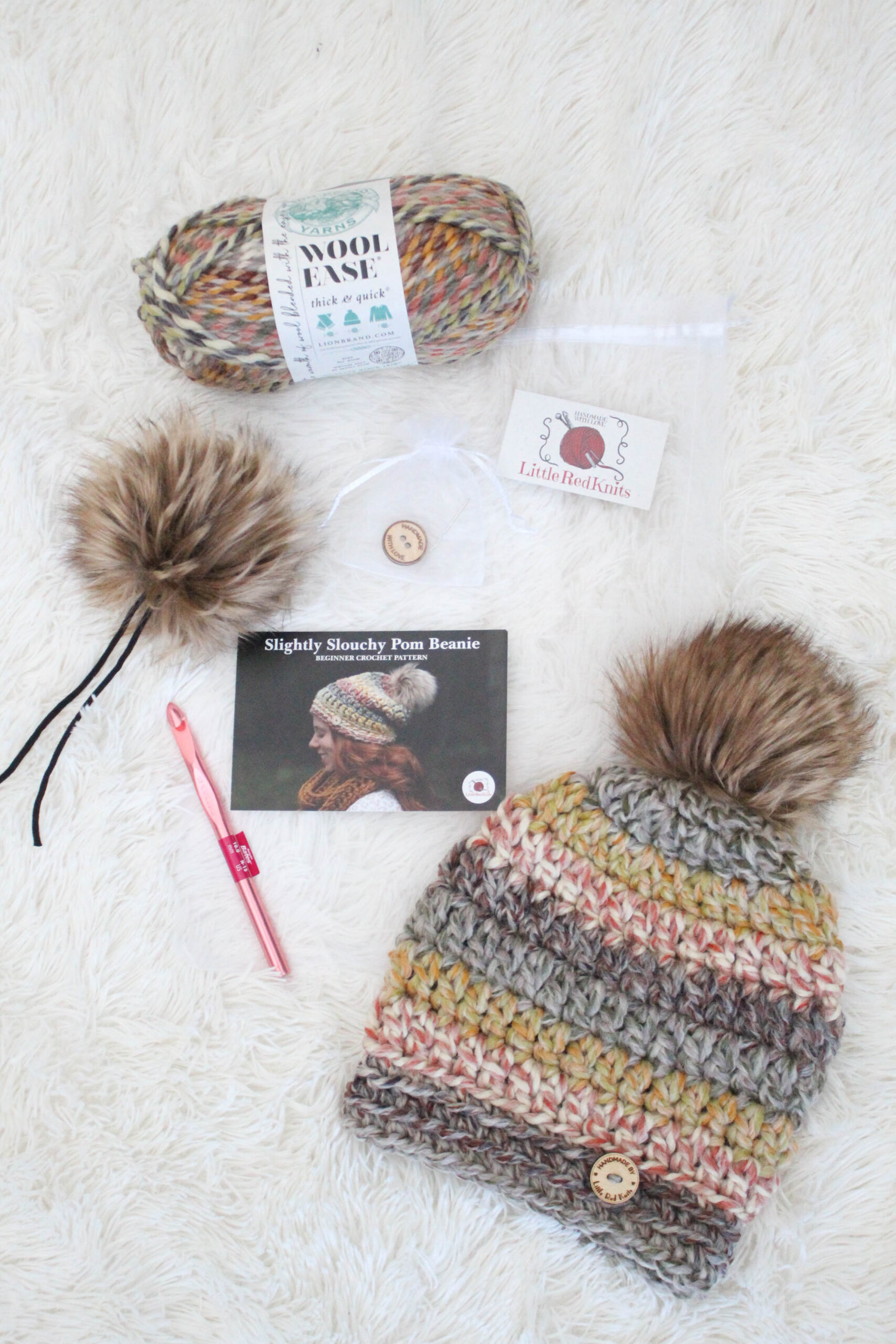 DIY CROCHET BEANIE KIT! This listing is a CROCHET KIT to make yourself a Slightly Slouchy Pom Beanie. This listing DOES NOT include a finished hat, but all of the tools for you to crochet one on your own.